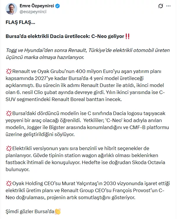 Oyak Holding CEO'su Murat Yalçıntaş'ın 2030 vizyonunda işaret ettiği elektrikli üretim planı ve Renault Group CEO'su François Provost'un C-Neo doğrulaması, projenin artık somutlaştığını gösteriyor.