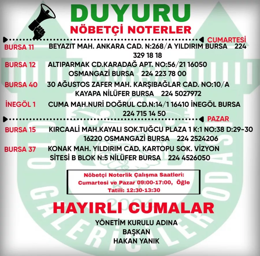 Bursa Bölge, 2026.02.20 17:07Bursa'da hafta sonu hizmet verecek nöbetçi noterlikler belli oldu. Vatandaşların resmi işlemlerini aksatmaması için Cumartesi ve Pazar günleri belirlenen noterlikler 09.00-17.00 saatleri arasında hizmet verecek. Öğle tatili ise 12.30-13.30 saatleri arasında uygulanacak.