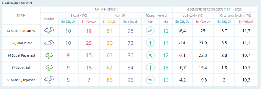 Bursa Bölge, 2026.02.14 00:54Meteoroloji Genel Müdürlüğü Bursa için 5 günlük hava tahmin raporunu açıkladı. Açıklanan rapora göre Bursa'da hafta sonu mevsim normallerine göre oldukça sıcak ancak yağışlı bir hava olacak. Yeni hafta ile birlikte sıcaklıklarda çok sert bir düşüşün olması bekleniyor.