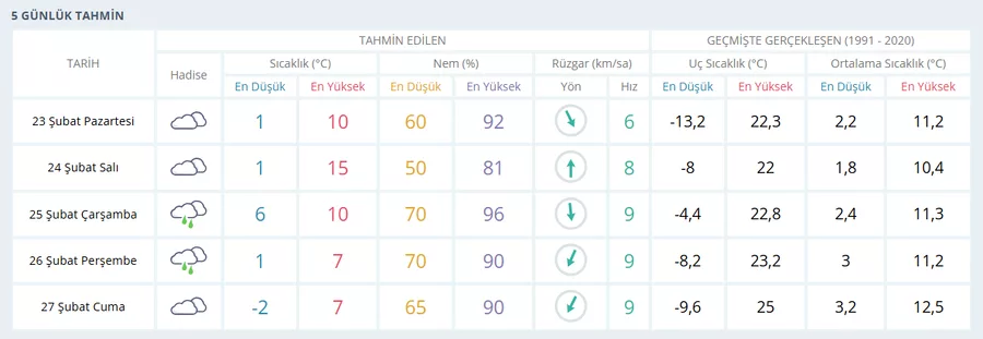 Bursa Bölge, 2026.02.23 00:47Bursa hava durumu için yapılan son tahminlere göre kentte önümüzdeki 5 gün boyunca bulutlu ve yer yer yağışlı bir hava etkili olacak. Sıcaklıklar hafta ortasında düşerken, cuma günü gece saatlerinde eksi dereceler görülebilir.