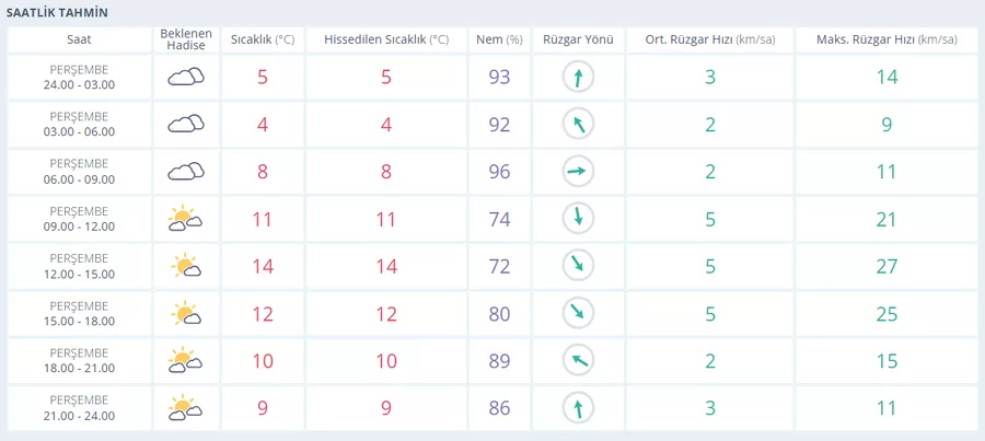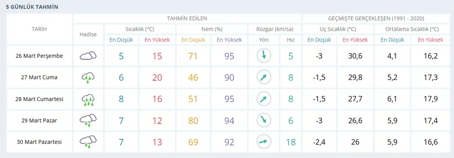 Yeni haftanın ilk gününde yağışlar etkisini biraz azaltsa da yer yer devam edecek. Sıcaklıklar 7°C ile 13°C arasında değişirken, Pazartesi gününün en dikkat çekici detayı rüzgar hızı olacak. Rüzgarın saatte 18 km hıza ulaşması bekleniyor. Nem oranı ise %69 ile %92 arasında seyrederek günü tamamlayacak.