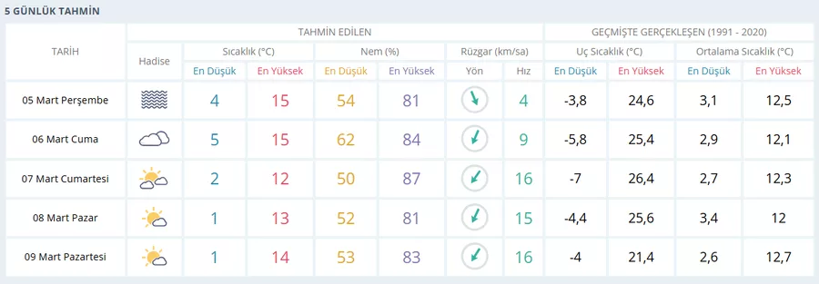 🌤 5 Günlük Hava Tahmini (5-9 Mart)