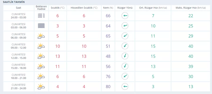 Bursa'da cumartesi günü sisli bir hava etkili olacak. Günün en düşük sıcaklığı 4°C, en yüksek sıcaklığı ise 13°C olarak tahmin ediliyor. Nem oranı yüzde 48 ile 84 arasında değişirken rüzgarın ortalama 14 km/sa hızla esmesi bekleniyor.