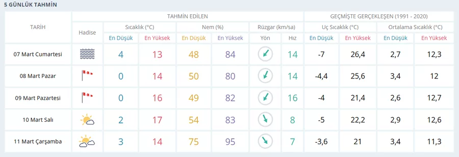 Bursa Bölge, 2026.03.07 00:51Meteoroloji verilerine göre Bursa'da önümüzdeki 5 gün boyunca hava sıcaklıkları kademeli olarak artacak. Hafta sonu serin ve yer yer sisli bir hava beklenirken, yeni haftada sıcaklıkların 16-17 dereceye kadar yükselmesi öngörülüyor. Özellikle sabah ve gece saatlerinde düşük sıcaklıklar dikkat çekerken, gündüz saatlerinde daha ılık bir hava etkili olacak.