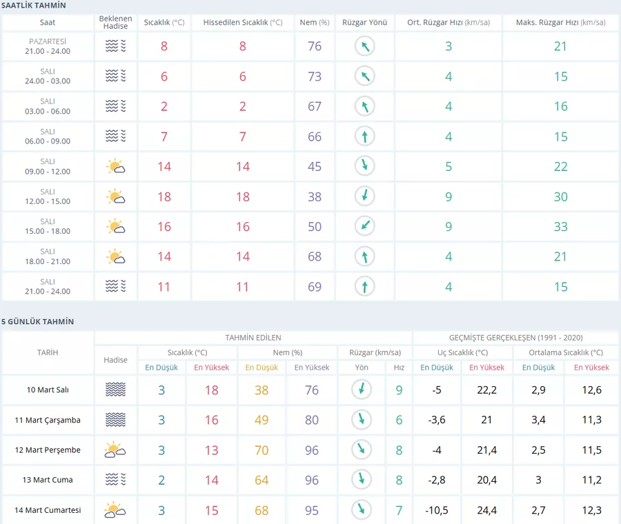 - 00.00 - 03.00: Gece saatlerinde sisli hava etkili. Sıcaklık 6°C.