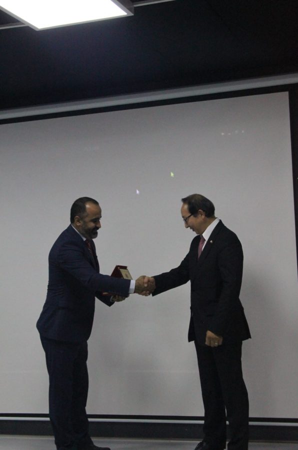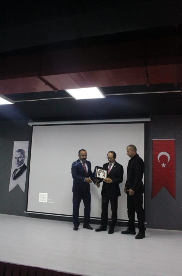 Sunumunu yaptıktan sonra, Özel Bursa Arena Anadolu ve Fen Lisesi Kurucusu Celal Arslan, Japon Başkonsolos Hisau Nishimaki'ye Bursa'nın kültürel simgesi olan Karagöz ve Hacıvat çinisini takdim etti.