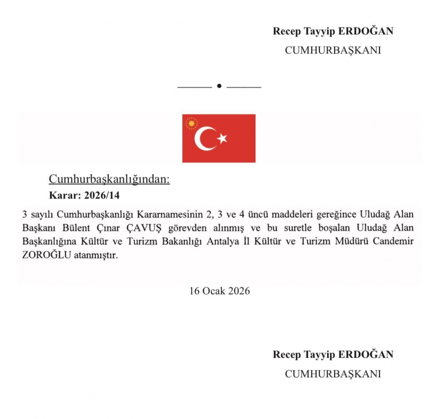Bursa Bölge, 2026.01.17 00:2517 Ocak 2026 Cumartesi günü Resmi Gazete'de yayımlanan Cumhurbaşkanlığı Kararnamesine göre Bursa Uludağ Alan Başkanı Bülent Çınar Çavuş görevinden alındı. Yerine atanan isim belli oldu.