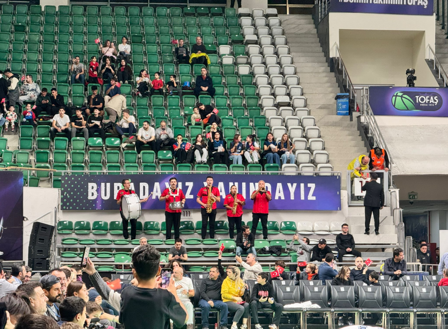 Spor, 2025.10.28 20:02Tofaş Spor Kulübü'nün La Laguna Tenerife ile Basketbol Şampiyonlar Ligi 3. hafta karşılaşmasının başlamasına dakikalar kala bando ekibi eşliğinde Cumhuriyet Bayramı kutlandı.