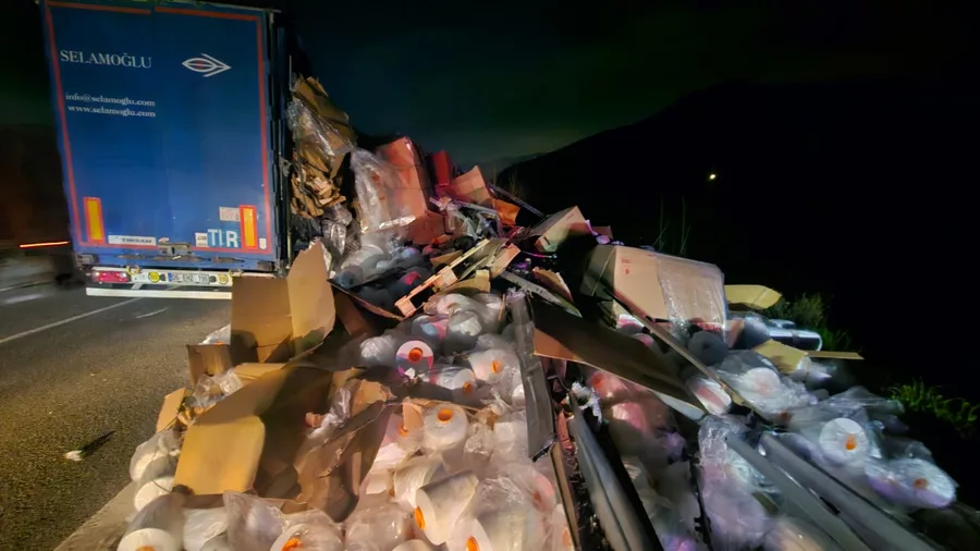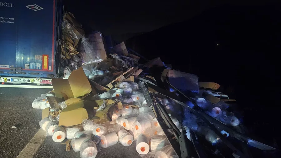 Bursa Bölge, 2026.03.27 20:30Bursa'da , Gebze - Orhangazi- İzmir otoyolu Gemlik yakınlarında meydana gelen trafik kazasında iplik bobin yüklü tır kontrolden çıkarak yol kenarına devrildi. Tır sürücüsü kazadan yara almadan kurtulurken üzerindeki bobinler etrafa saçıldı .