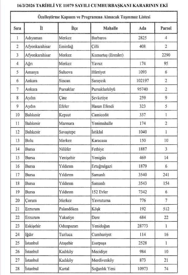 Bursa'nın 6 bölgesindeki devlete ait taşınmazlarla ilgili yeni özelleştirme kararı yürürlüğe girdi. Resmi Gazete'de duyurulan Cumhurbaşkanı Kararı ile mülkiyeti Maliye Hazinesi'ne ait olan 55 taşınmazın özelleştirme programına dahil edildiği duyuruldu. Bu kapsamda Bursa'nın 3 farklı ilçesinde bulunan 6 taşınmazın da satışı, kiralanması veya gelir ortaklığı modeliyle değerlendirilmesinin önü açıldı. Sürecin Özelleştirme İdaresi Başkanlığı tarafından 31 Aralık 2028 tarihine kadar tamamlanması hedefleniyor.