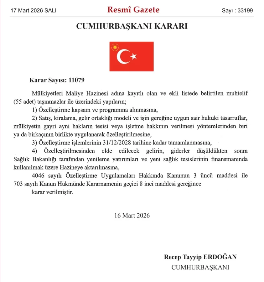 Bursa Bölge, 2026.03.17 01:04Resmi Gazete'de yayımlanan Cumhurbaşkanı Kararı ile Türkiye genelinde 55 taşınmaz özelleştirme kapsamına alındı. Listede Bursa'nın 3 farklı ilçesindeki 6 taşınmaz da yer alırken, elde edilecek gelirin sağlık yatırımlarında kullanılacağı açıklandı.