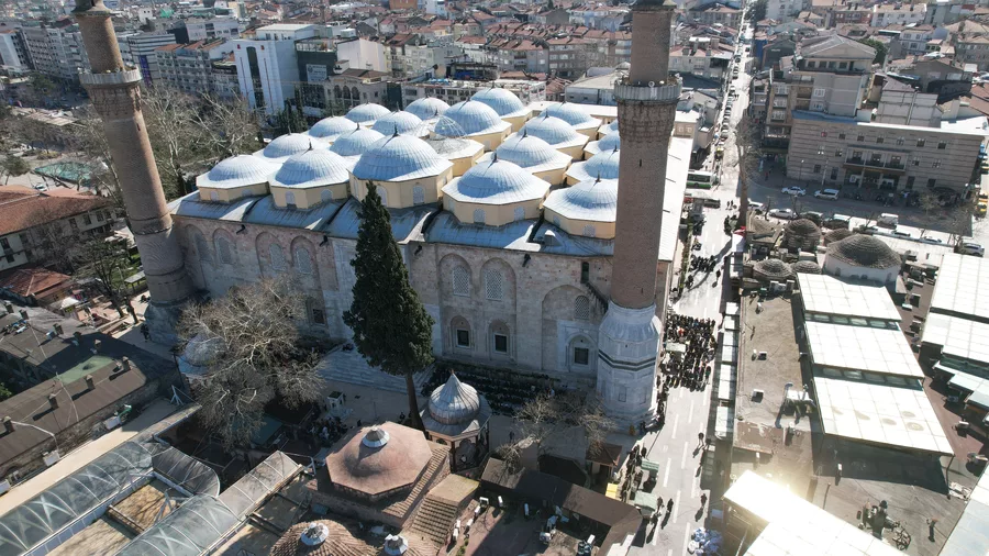 Bursa Bölge, 2026.02.20 15:37Ramazan ayının ilk cuma namazında Bursa'da camiler dolup taştı. Başta Ulu Cami olmak üzere kent genelindeki camilerde yoğunluk yaşandı. Cami içerisinde yer bulamayan vatandaşlar, namazlarını cami avlularında ve çevresinde saf tutarak eda etti. Yoğunluğun yaşandığı anlar havadan drone ile görüntülendi.