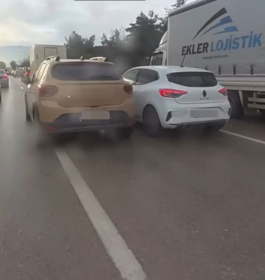 Osmangazi ilçesi Ankara Yolu'ndan kent merkezi istikametine seyir halinde olan iki otomobilin sürücüsü, bir anda araçlarıyla aynı şeride geçti. Sürücüler, araçlarını birbirlerinin üzerine sürerek trafiği tehlikeye attı. Aynı şeridi paylaşmaya çalışan sürücülerin 'şerit' kavgası, arkadan gelen bir motosiklet sürücüsünün kask kamerasına yansıdı.