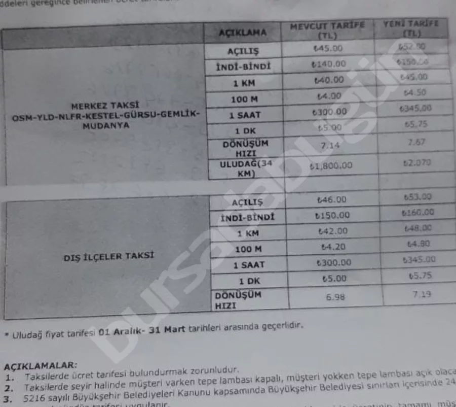 Büyükorhan, Orhaneli, Keles, Harmancık, Orhangazi, İznik, Karacabey, Mustafakemalpaşa, İnegöl ve Yenişehir ilçelerinde geçerli olacak taksi fiyatları da belli oldu. 15 Mart'tan itibaren açılış ücretleri 46 TL'den 53 TL'ye, indi bindi 150 TL'den 160 TL'ye, kilometre başı ise 42 TL'den 48 TL'ye yükselecek.