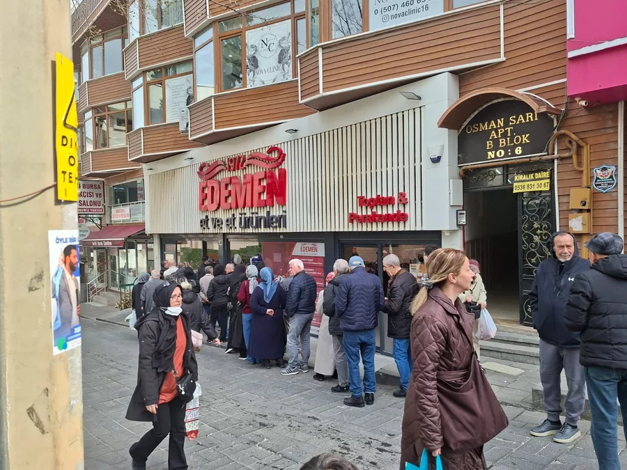 Bursa'nın en işlek noktalarından Kapalı Çarşı girişinde bulunan bir et marketinde, uygun fiyatlı et alabilmek isteyen vatandaşlar uzun kuyruklar oluşturdu. Yoğun ilgi nedeniyle metrelerce uzayan kuyruk dikkat çekti.