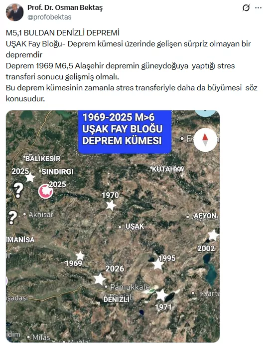 Güncel, 2026.03.09 10:50Denizli'nin Buldan ilçesinde meydana gelen 5,1 büyüklüğündeki deprem, uzmanlara göre sürpriz değil. Deprem bilimci Prof. Dr. Osman Bektaş, sarsıntının Uşak Fay Bloğu üzerinde gelişen bir deprem kümesinin parçası olduğunu belirtti.