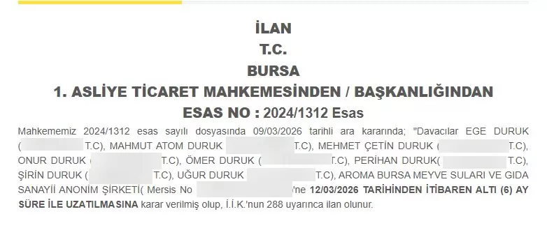 Ekonomi, 2026.03.16 13:18Türkiye'nin önde gelen içecek markalarından Aroma Bursa Meyve Suları ve Gıda Sanayii A.Ş., konkordato sürecinde önemli bir gelişme yaşandı. Bursa 1. Asliye Ticaret Mahkemesi, şirket için daha önce verdiği 1 yıllık kesin konkordato mühletinin süresini 6 ay daha uzattı.