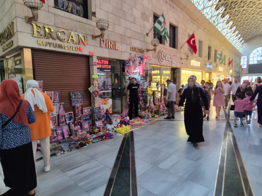 Bursa Bölge, 2024.07.28 14:40Bursa Kapalı Çarşı'da pazar günü satıcılar mağazaların önüne ürünlerini serdi. Kapalı mağazaların önüne kadar serilen ürünler dikkat çekti.