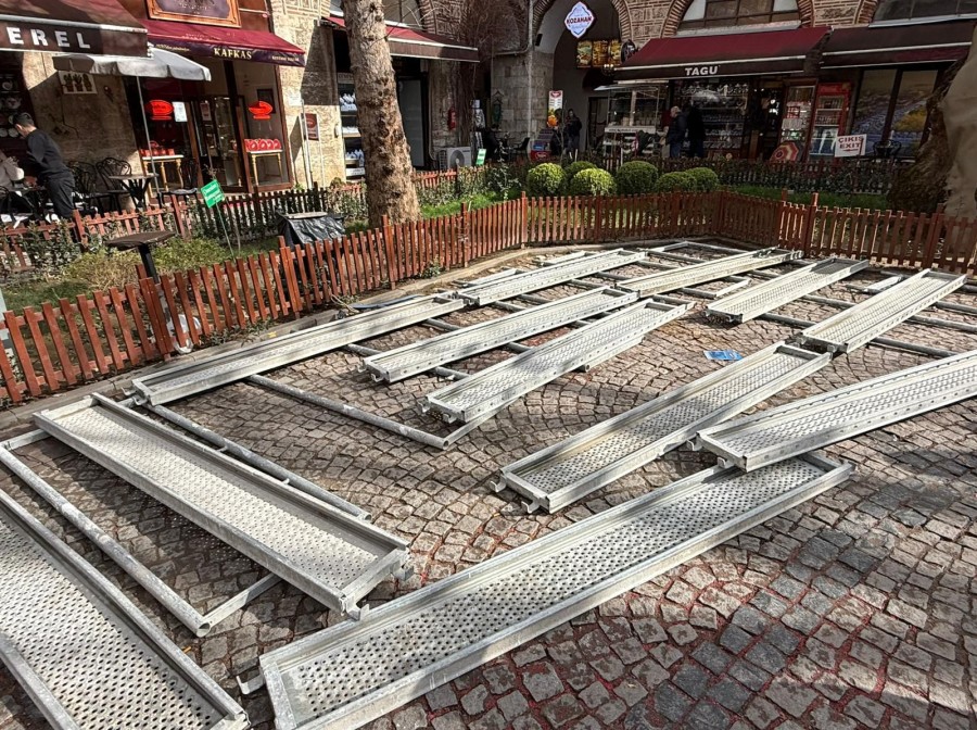 Bursa Bölge, 2026.02.12 12:25Bursa Koza Han'da mahkemenin bir esnafla ilgili tahliye kararını durdurmasının ardından, avludaki boş alanlara demir düzenekler yerleştirildiği iddia edildi. Esnaf, masa konulmasını engellemek için yapılan bu hamlenin tarihi dokuya zarar verdiğini ve ziyaretçiler için tehlike oluşturduğunu savundu.