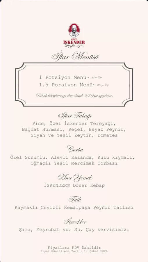 Bursa Bölge, 2026.02.19 10:261867'den beri hizmet veren, Bursa'nın meşhur İskender'ini yıllardır masalara sunan dünyaca ünlü Kebapçı İskender, Ramazan ayına özel iftar menülerini ve fiyatlarını paylaştı.