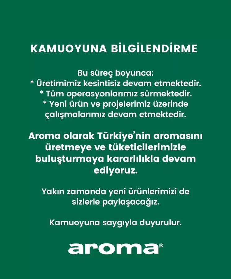 Aroma tarafından yapılan duyuruda ayrıca, "Türkiye'nin aromasını üretmeye ve tüketicilerimizle buluşturmaya kararlılıkla devam ediyoruz. Yakın zamanda yeni ürünlerimizi de sizlerle paylaşacağız" ifadelerine yer verildi.