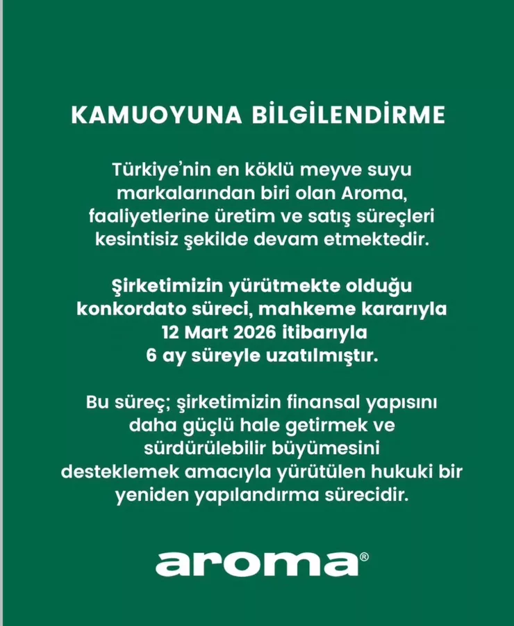 Bursa Bölge, 2026.03.19 09:24Türkiye'nin köklü meyve suyu markalarından Aroma, kamuoyuna yaptığı açıklamayla yürüttüğü konkordato sürecine ilişkin son durumu paylaştı. Şirket, üretim ve satış faaliyetlerinin kesintisiz şekilde devam ettiğini vurguladı.