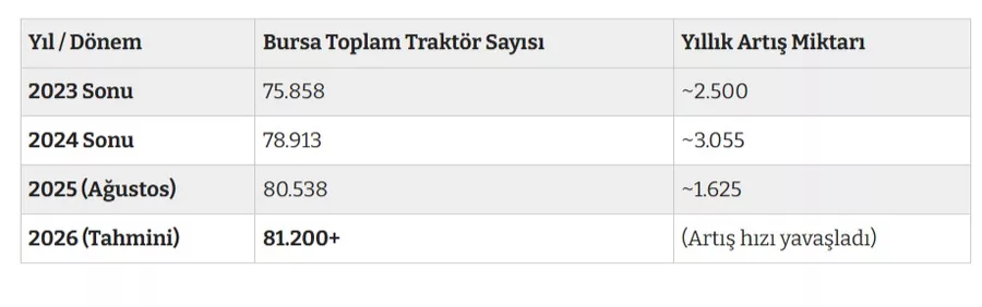 Bursa'da trafiğe kayıtlı toplam traktör sayısı, 2025 yılı Temmuz ayı sonu itibarıyla 80 bin 253 adede ulaştı. 2024 yılının aynı döneminde bu rakam 77 bin 638 civarındaydı.