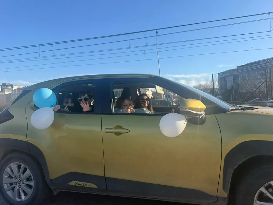 Aracın arkasına asılan kağıtta, "Oğlum Eymen'in doğum gününü kutlamak için kornaya basar mısınız?" ifadeleri yer aldı. Yazıyı gören sürücüler ise duyarsız kalmadı. Kimi selektör yaptı, kimi de kornaya basarak küçük Eymen'in doğum gününü kutladı.