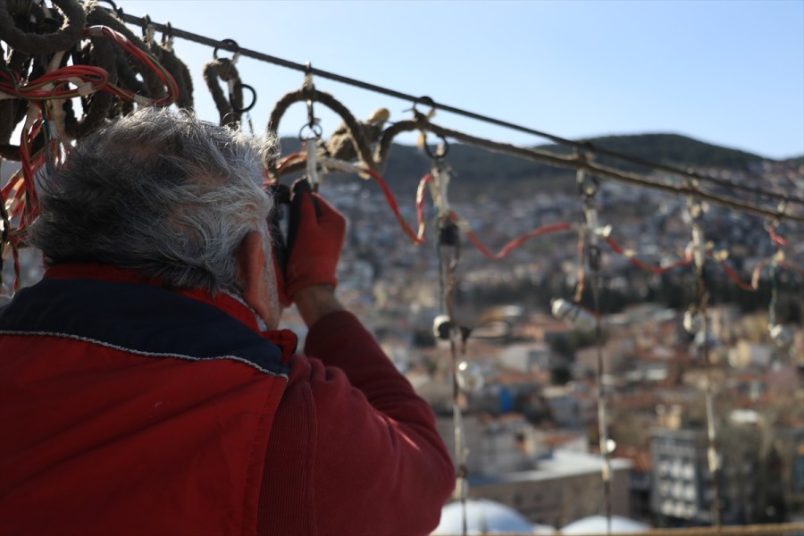 Bursa'da, selatin camileri arasında bulunan tarihi Ulu Cami'ye, Kültür ve Turizm Bakanlığı Bursa Vakıflar Bölge Müdürlüğünün koordinesinde, Osmanlı'nın son mahyacısı Hacı Ali Ceyhan'ın çırağı Kahraman Yıldız'ın başında olduğu ekip tarafından hazırlanan mahya yerleştiriliyor.