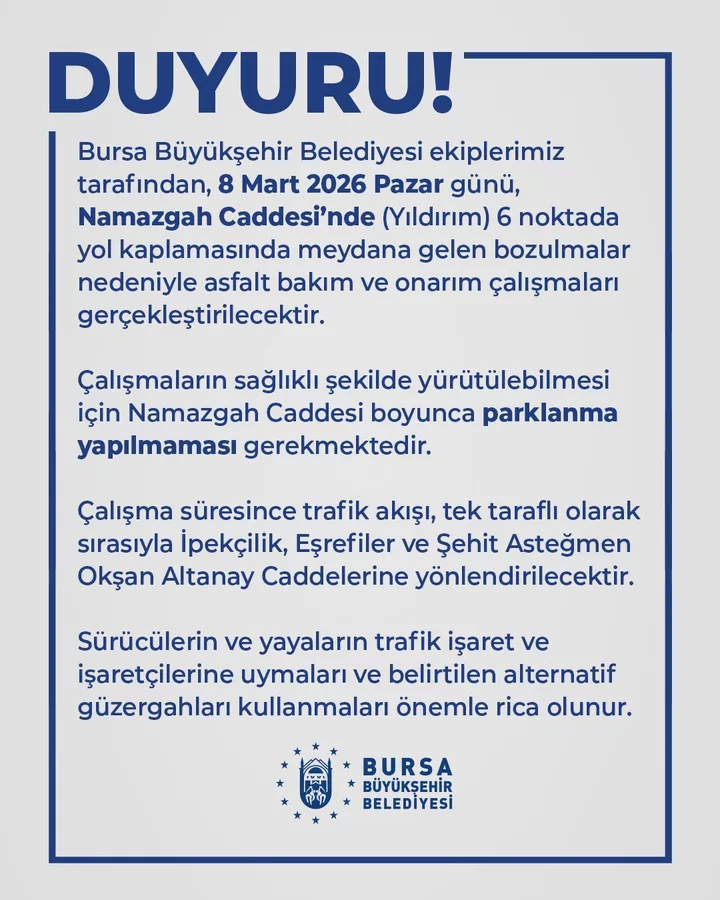 "Bursa Büyükşehir Belediyesi ekiplerimiz tarafından, 8 Mart 2026 Pazar günü, Namazgah Caddesi'nde (Yıldırım) 6 noktada yol kaplamasında meydana gelen bozulmalar nedeniyle asfalt bakım ve onarım çalışmaları gerçekleştirilecektir. Çalışmaların sağlıklı şekilde yürütülebilmesi için Namazgah Caddesi boyunca parklanma yapılmaması gerekmektedir. Çalışma süresince trafik akışı, tek taraflı olarak sırasıyla İpekçilik, Eşrefiler ve Şehit Asteğmen Okşan Altanay Caddelerine yönlendirilecektir. Sürücülerin ve yayaların trafik işaret ve işaretçilerine uymaları ve belirtilen alternatif güzergahları kullanmaları önemle rica olunur." ifadelerine yer verildi.