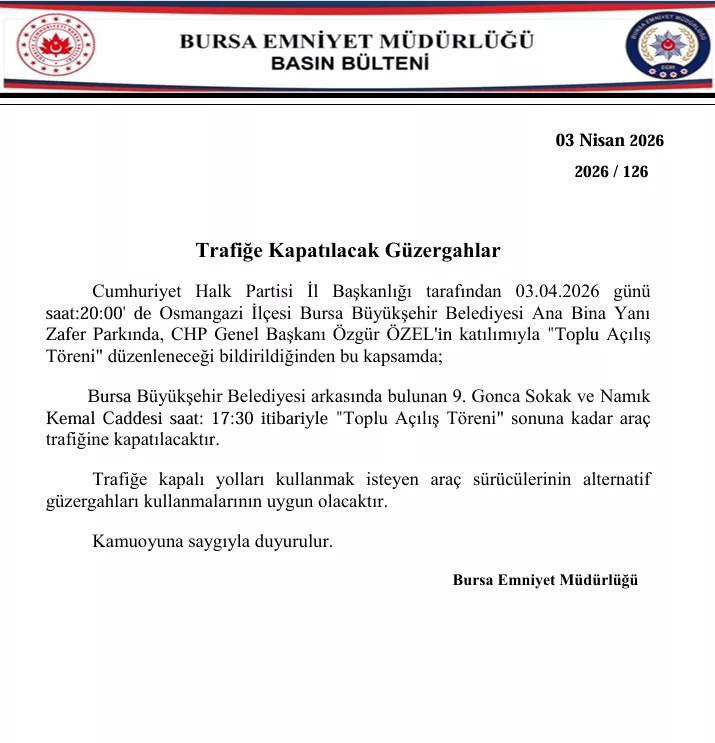 Bursa Bölge, 2026.04.03 17:31Bursa Emniyet Müdürlüğü tarafından yapılan açıklamaya göre, 3 Nisan 2026 Cuma günü CHP Genel Başkanı Özgür Özel'in katılımıyla düzenlenecek miting nedeniyle bazı yollar araç trafiğine kapatılacak.