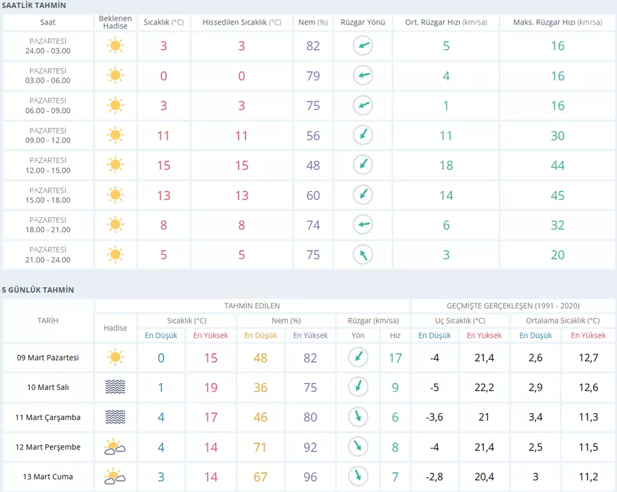 - 00.00 - 03.00: Hava açık, sıcaklık 3°C, nem yüzde 82.