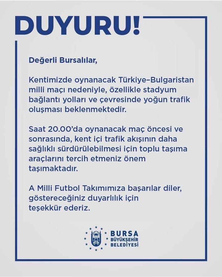Bursa Bölge, 2025.11.15 16:40Bu akşam saat 20.00'de kentimizde oynanacak olan Türkiye-Bulgaristan millî maçı öncesi ve sonrasında Bursa Büyükşehir Belediyesi, Bursalılara önemli bir ulaşım çağrısı yaptı.