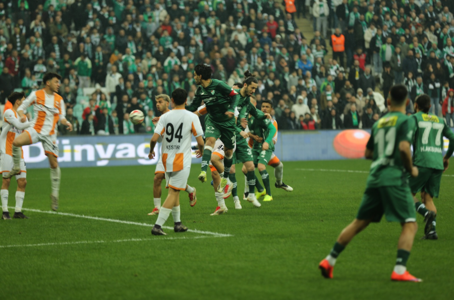 Dk.18. Bursaspor Sol kanattan İlhan Depe ile korner kullandı. Kale sahasında topa yükselen Ertuğrul Ersoy iy bir vuruş yapamayınaca top kale direğinin yanından auta gitti.