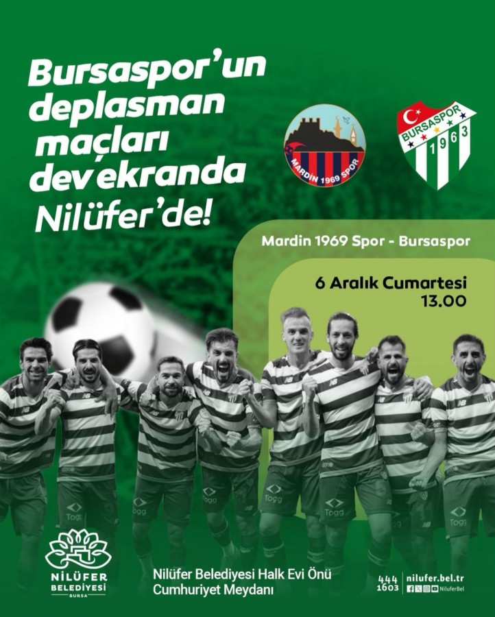 TFF 2. Lig 14. hafta karşılaşmasında Bursaspor ile Mardin 1969 Spor, Kızıltepe İlçe Stadı'nda karşılaşacak. Nilüfer Belediyesi, Halk Evi önünde ekran kurarak yeşil-beyazlı taraftarların maçı birlikte izlemesine imkân sağlayacak.