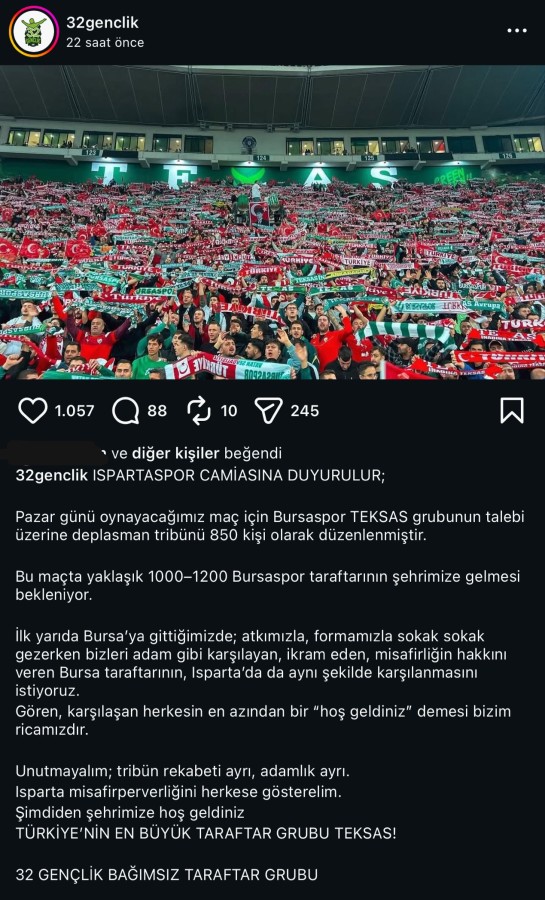 32 Gençlik, sosyal medyadan yaptıkları açıklamada, "Pazar günü oynayacağımız maç için Bursaspor TEKSAS grubunun talebi üzerine deplasman tribünü 850 kişi olarak düzenlenmiştir. Bu maçta yaklaşık 1000-1200 Bursaspor taraftarının şehrimize gelmesi bekleniyor. Ilk yarıda Bursa'ya gittiğimizde; atkımızla, formamızla sokak sokak gezerken bizleri adam gibi karşılayan, ikram eden, misafirliğin hakkını veren Bursa taraftarının, Isparta'da da aynı şekilde karşılanmasını istiyoruz. Gören, karşılaşan herkesin en azından bir "hoş geldiniz" demesi bizim ricamızdır. Unutmayalım; tribün rekabeti ayrı, adamlık ayrı. Isparta misafirperverligini herkese gösterelim. Şimdiden şehrimize hoş geldiniz Türkiye'nin en büyük taraftar grubu Teksas" ifadelerini kullanarak birlik ve beraberliğin önemine değindi.