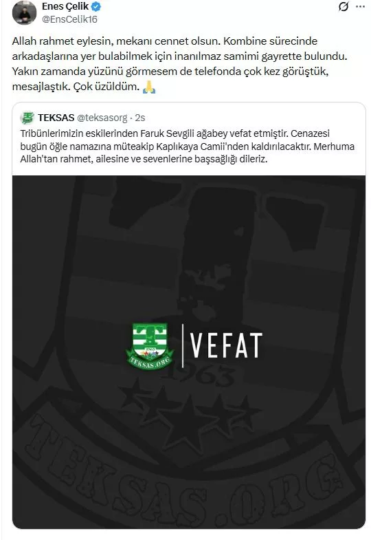 Bursaspor Başkanı Enes Çelik, acı haberin ardından bir taziye paylaşımında bulundu. Faruk Sevgili'nin kombine sürecinde büyük emek verdiğini vurgulayan Başkan Çelik, mesajında şu ifadelere yer verdi: