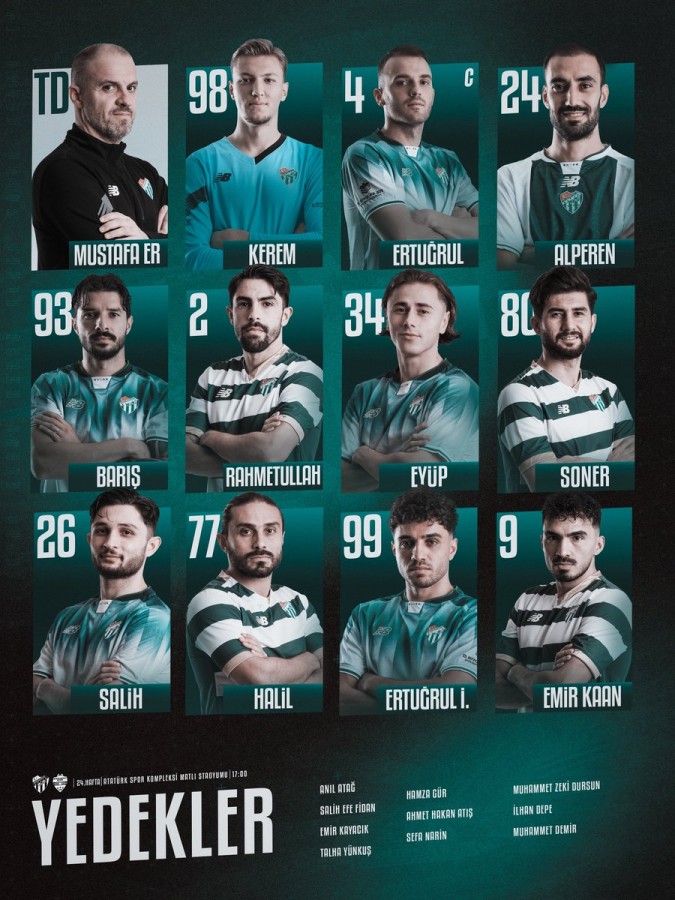 Bursa Bölge, 2026.02.15 16:02Bursaspor, ligin 24. haftasında Atatürk Spor Kompleksi Matlı Stadyumu'nda Granny's Waffles Kırklarelispor'u ağırlıyor. Mücadeleye dakikalar kala Bursaspor'un ilk 11'i belli oldu.