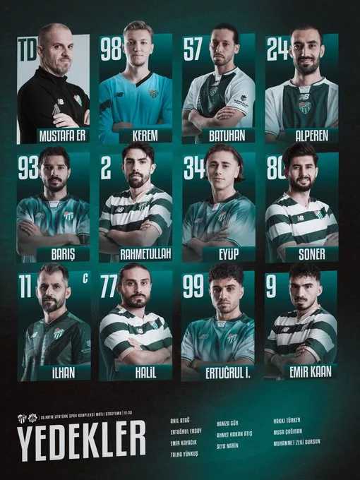 TFF 2. Lig Kırmızı Grup'ta zirve mücadelesini sürdüren Bursaspor, bu hafta kendi evinde Atatürk Spor Kompleksi Matlı Stadyumu'nda ağırlayacağı rakibi karşısında sahaya çıkacağı kadroyu duyurdu. Teknik Direktör Mustafa Er'in belirlediği ilk 11'de tecrübe ve genç dinamizmi bir arada görülüyor.