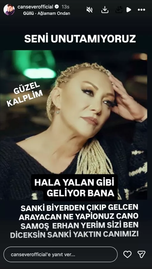 Güllü'nün fotoğrafını paylaşan Cansever, "Seni unutamıyoruz. Güzel kalplim... Hala yalan gibi geliyor bana. Sanki bir yerde çıkıp geleceksin, arayacaksın 'ne yapıyorsun cano Samoş, Erhan yerim sizi ben' diyeceksin sanki. Yaktın canımızı" ifadelerini kullandı.
