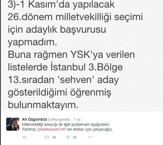 Twitter hesabından açıklama yapan Özgündüz, "1 Kasım'da yapılacak 26. dönem milletvekilliği seçimi için adaylık başvurusu yapmadım. Buna rağmen YSK'ya verilen listelerde İstanbul 3. Bölge 13. sıradan 'sehven' aday gösterildiğimi öğrenmiş bulunmaktayım" diye yazdı.