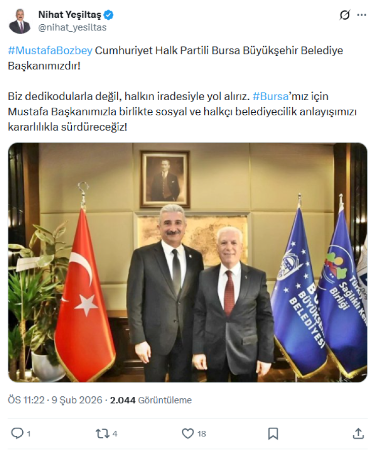 Bursa Bölge, 2026.02.09 23:42Bursa Büyükşehir Belediye Başkanı Mustafa Bozbey'in istifa edeceğine dair çıkan söylentiler bir yanıtta CHP Bursa İl Başkanı Nihat Yeşiltaş'tan geldi.