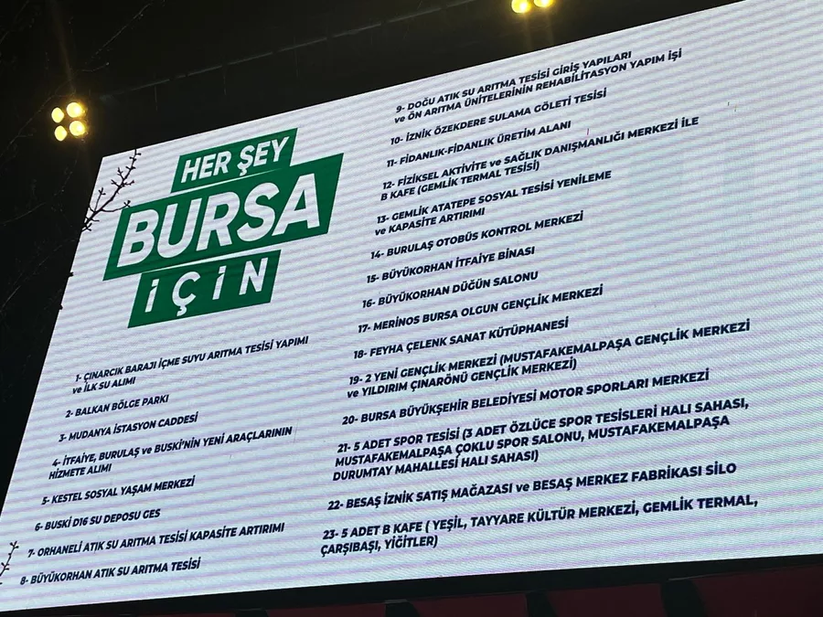 Bu kapsamda; Çınarcık Barajı İçme Suyu Arıtma Tesisi yapımı ve ilk su alımı, Balkan Bölge Parkı, Mudanya İstasyon Caddesi, İtfaiye, BURULAŞ ve BUSKİ'nin yeni araçlarının hizmete alınması, Kestel Sosyal Yaşam Merkezi, BUSKİ D16 Su Deposu, Orhaneli Atık Su Arıtma Tesisi kapasite artırımı, Büyükorhan Atık Su Arıtma Tesisi, Doğu Atık Su Arıtma Tesisi giriş yapıları ve ön arıtma üniteleri rehabilitasyonu projeleri kamuoyuna tanıtılarak hizmete açıldı.