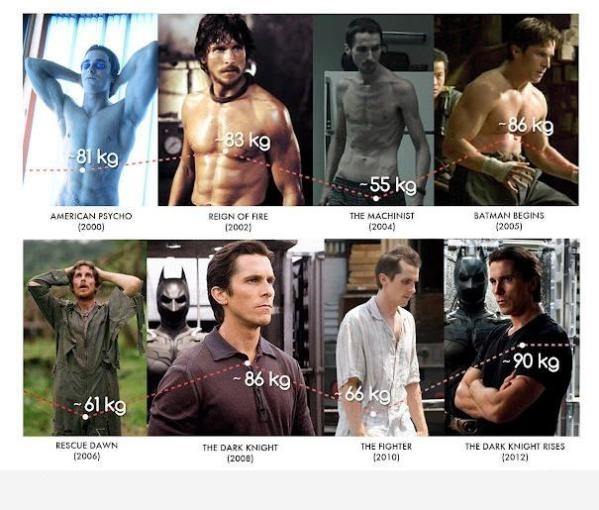 Başarılı oyuncu Christian Bale, 2000 yılında gösterime giren Patrick Bateman karakterine hayat verdiği 'Amerikan Sapığı' filminde 81 kg iken, 2004 yılında sanayide torna ustası olarak çalışan ve insomnia (uyuyamama) hastalığı olan Trevor Reznik'i canlandırdığı 'Makinist'te 55 kg ile karşımıza çıktı. Çektiği Makinist filminden 6 ay sonra 'Batman Başlıyor' adlı filminde Bruce Wayne karakterini canlandıran oyuncu, 4 sene içinde verdiği kiloları fazlasıyla geri alarak 30 kg kadar ağırlığını artırmayı başarmış, uyguladığı beslenme yöntemi ve antrenmanları sayesinde yoğun kas kazanmıştır.