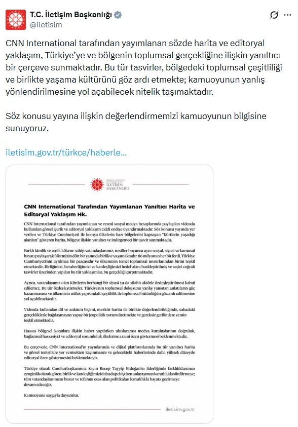 Bu çerçevede, CNN International'ın yayınlarında ve dijital platformlarında bu tür yanıltıcı harita ve görsel temsillere yer vermekten kaçınmasını ve gelecekteki haberlerinde daha yüksek düzeyde editoryal özen göstermesini beklemekteyiz. Türkiye olarak Cumhurbaşkanımız Sayın Recep Tayyip Erdoğan'ın liderliğinde farklılıklarımızı zenginlik olarak gören, birlik ve kardeşliğimizi daha da pekiştiren anlayışımızı kararlılıkla sürdürmeye; tüm vatandaşlarımızın huzur ve refahını esas alan politikaları kararlılıkla hayata geçirmeye devam edeceğiz. Kamuoyuna saygıyla duyurulur."