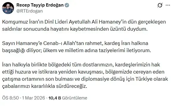 Güncel, 2026.03.01 21:00Cumhurbaşkanı Erdoğan, "Komşumuz İran'ın Dini Lideri Ayetullah Ali Hamaney'in dün gerçekleşen saldırılar sonucunda hayatını kaybetmesinden üzüntü duydum. Bölgemizde cereyan eden çatışma ortamının son bulması ve diplomasiye dönüş için Türkiye olarak çabalarımızı kararlılıkla sürdüreceğiz" dedi.