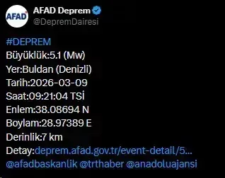 AFAD tarafından yapılan açıklamada, Denizli'deki 5.1 büyüklüğündeki depremin yalnızca şehir merkezinde değil, çevre illerde de hissedildiği belirtildi.