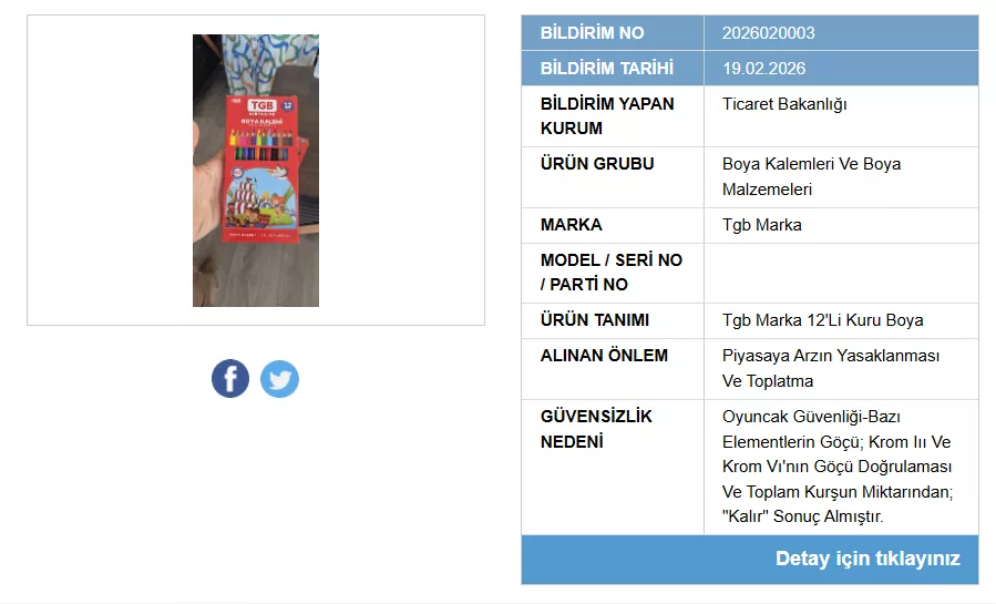 Ticaret Bakanlığı tarafından yapılan güvensiz ürün bildirimine göre, Tgb marka 12'li kuru boya setinin çocuk güvenliği açısından risk taşıdığı tespit edildi. Yapılan bildirimde, boya kalemlerinde krom ve krom VI elementlerinin göç değerlerinin doğrulanamadığı ve toplam kurşun miktarının sınır değerleri karşılamadığı belirtildi. Oyuncak güvenliği kriterlerini sağlamadığı belirlenen ürün için piyasaya arzın yasaklanması ve toplatma kararı alınırken, yetkililer tüketicileri söz konusu ürünü kullanmamaları konusunda uyardı.