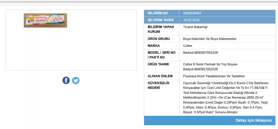 Collex marka yüz boyasının sağlığa risk taşıdığı belirlenirken, ürünün satışı yasaklandı ve piyasadaki ürünlerin toplatılmasına karar verildi.