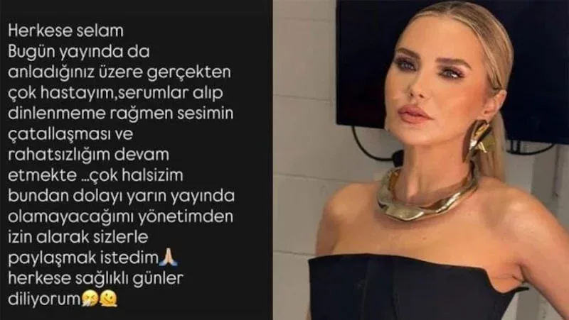 "Herkese selam bugün yayında da anladığınız üzere gerçekten çok hastayım. Serumlar alıp dinlenmeme rağmen sesimin çatallaşması ve rahatsızlığım devam etmekte. Bundan dolayı yayında olamayacağım yönetimden izin alarak sizlerle paylaşmak istedim. Herkese sağlıklı günler diliyorum."